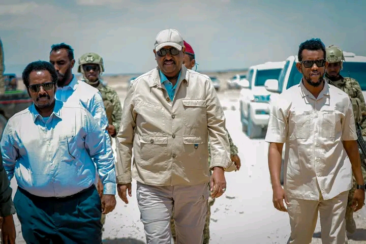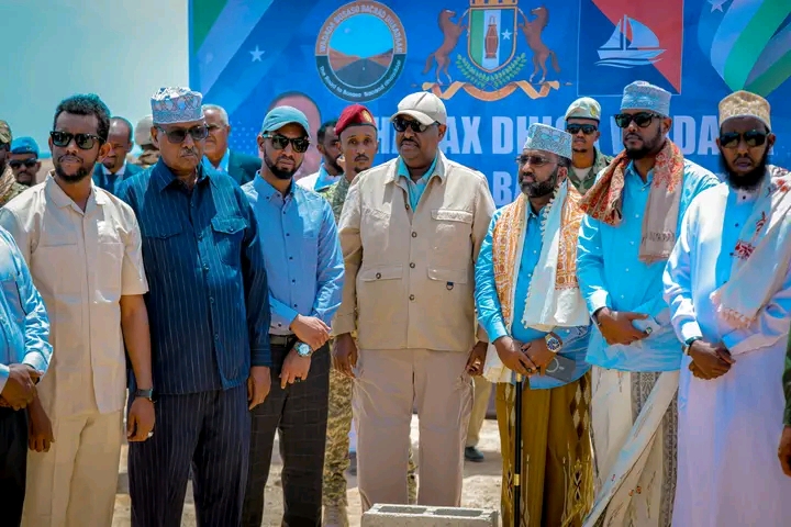 Bosaso : 09 August 2025 : The President of the Puntland State, His Excellency Said Abdullahi Deni, accompanied by the First Deputy Speaker of the House of Representatives, His Excellency Mohamed Bari Shire and Beldaje Mohamed Beldaje Ismail today laid the foundation stone of the Calmiskaad road that will connect the towns of Bosaso and Dhaadaar in Bari Region, with the event attended by the Councils of the Puntland State, the Traditional Council, the Bari Regional Administration Cheif Mr. Shahadoon Ali Yare, the Bosaso district administration